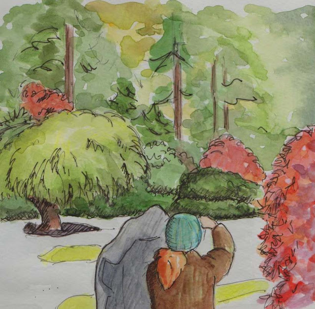 Yesterday, the Portland Urban Sketchers went to the Japanese Gardens to sketch. The leaves, along with the sketchers were very refrigerated and the colors were spectacular. With frozen fingers and so much glorious scenery all around, I was a bit overwhelmed and went mostly for an impression of the landscape. I would need some extra intense pigments to get anywhere near the actual colors.
