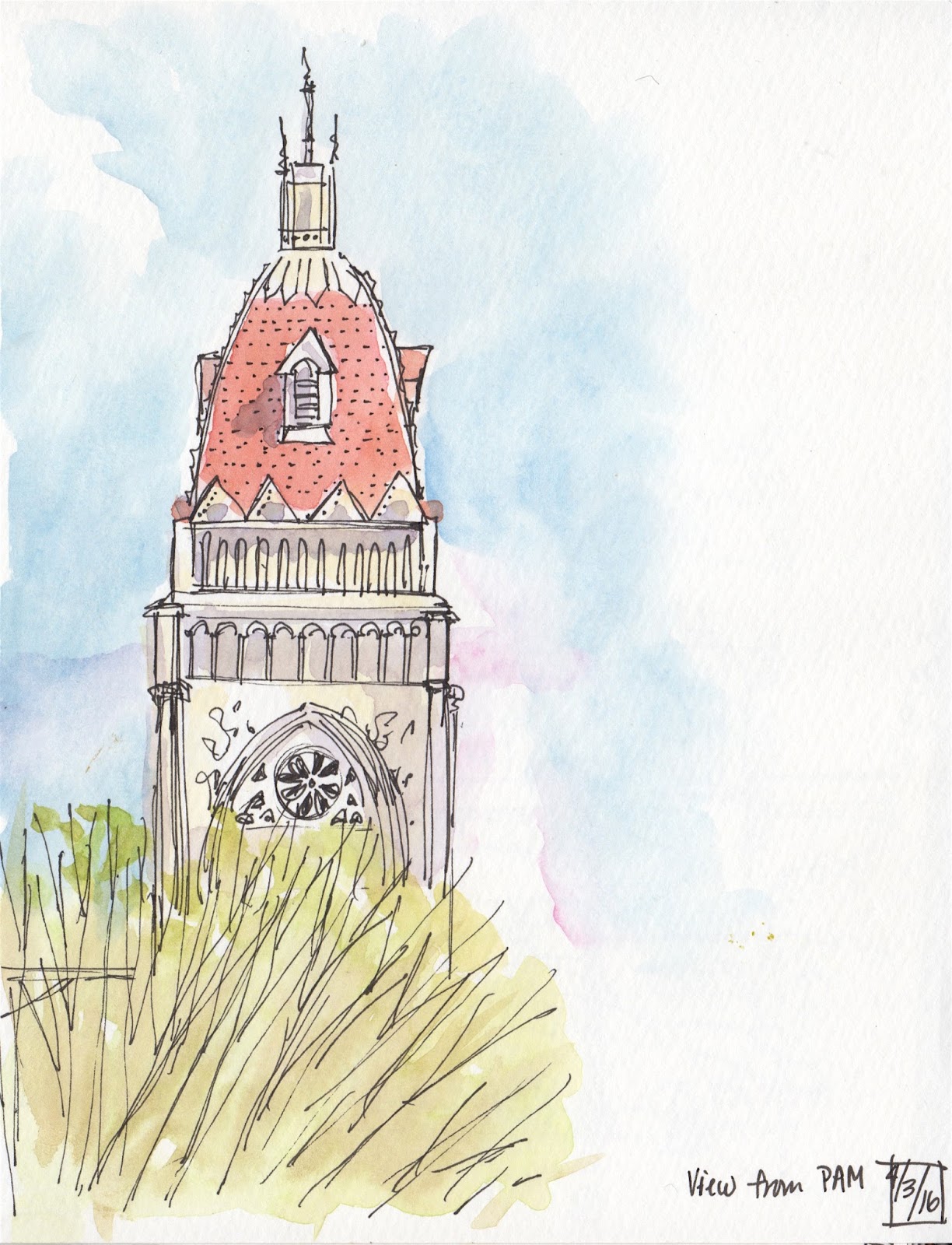 I sketched the top of the First Congregations Church from the sculpture court at the Portland Art Museum.